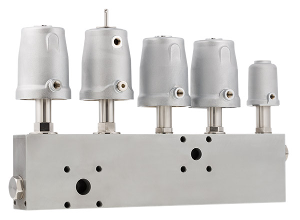 Compact valve manifolds with low piping effort, reduced maintenance time and minimize investment costs. A connection system well-known from the field of hydraulics and adapted to the respective application, allows for the intelligent combination of several valves in a customerspecific manifold. All necessary connections between the individual process valves are integrated in the manifold. Additional pressure and temperature sensors can be integrated at any time.