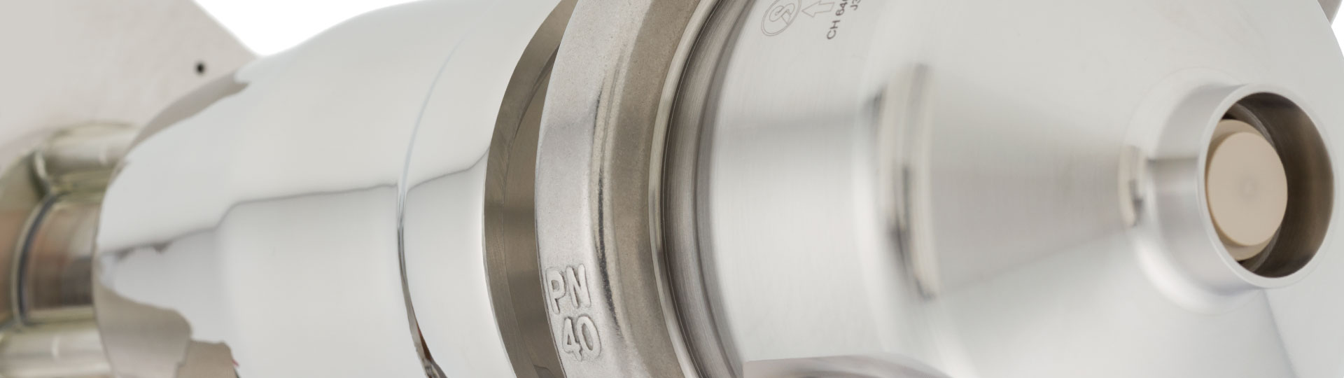The valve body is manufactured from pore-free stainless steel 1.4435 barstock material, finely turned or electropolished with roughness depths from Ra < 0.6 µm to Ra < 0.25 µm. The control plugs made of PEEK are FDA-compliant and meet the requirements of the USP Class VI, of the EU regulation 1935/2004 and the new plastics regulation 10/2011.